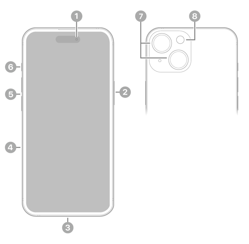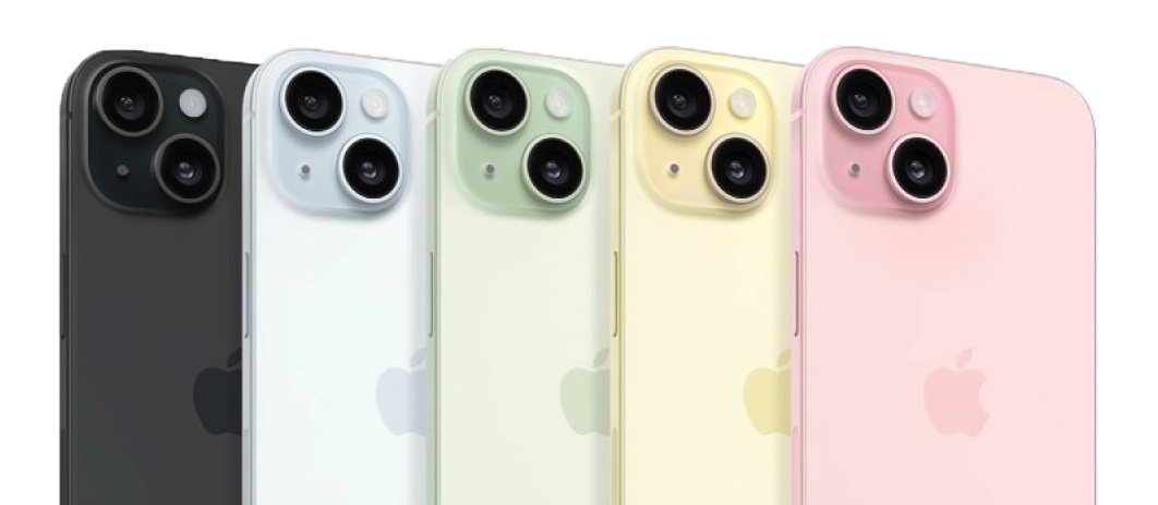 The iPhone 15 display has rounded corners within a standard rectangular shape. Diagonally, the screen measures 6.12 inches (actual viewable area is less).