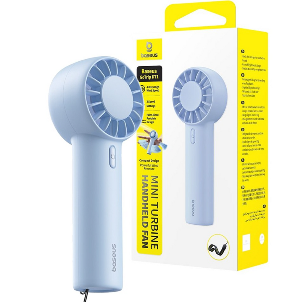 Easily transforms from a handheld fan to a stable desktop fan with full directional control.