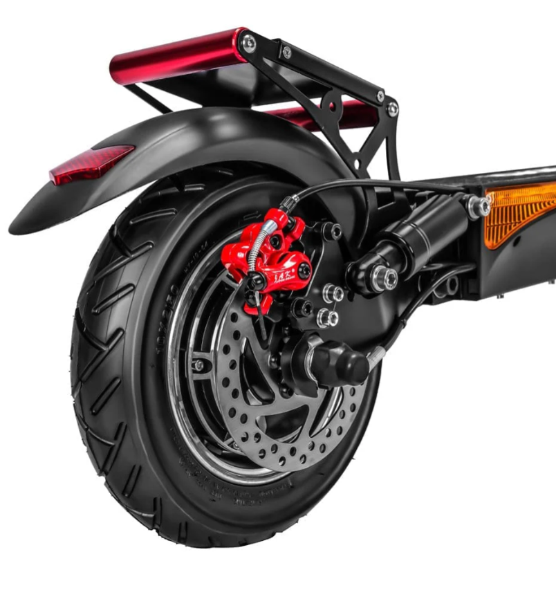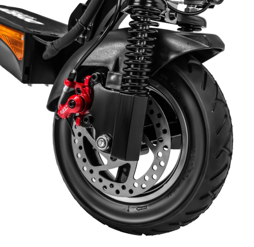 Unleash the thrill of an electrifying e-scooter adventure with front Dual shocks, rear Dual fluid-filled shocks, and 10-inch inflatable semi-slick road tires, ensuring safety and excitement for all riders.