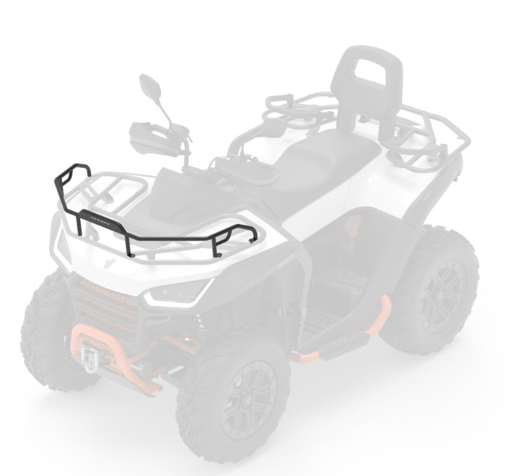 The Front Cargo Barrier Rail is a heavy-duty steel guard that bolts directly onto the front rack of the ATV. It creates a raised perimeter around the cargo area, acting as a "fence" to prevent gear, bags, or tools from sliding off during transit over rough terrain.
