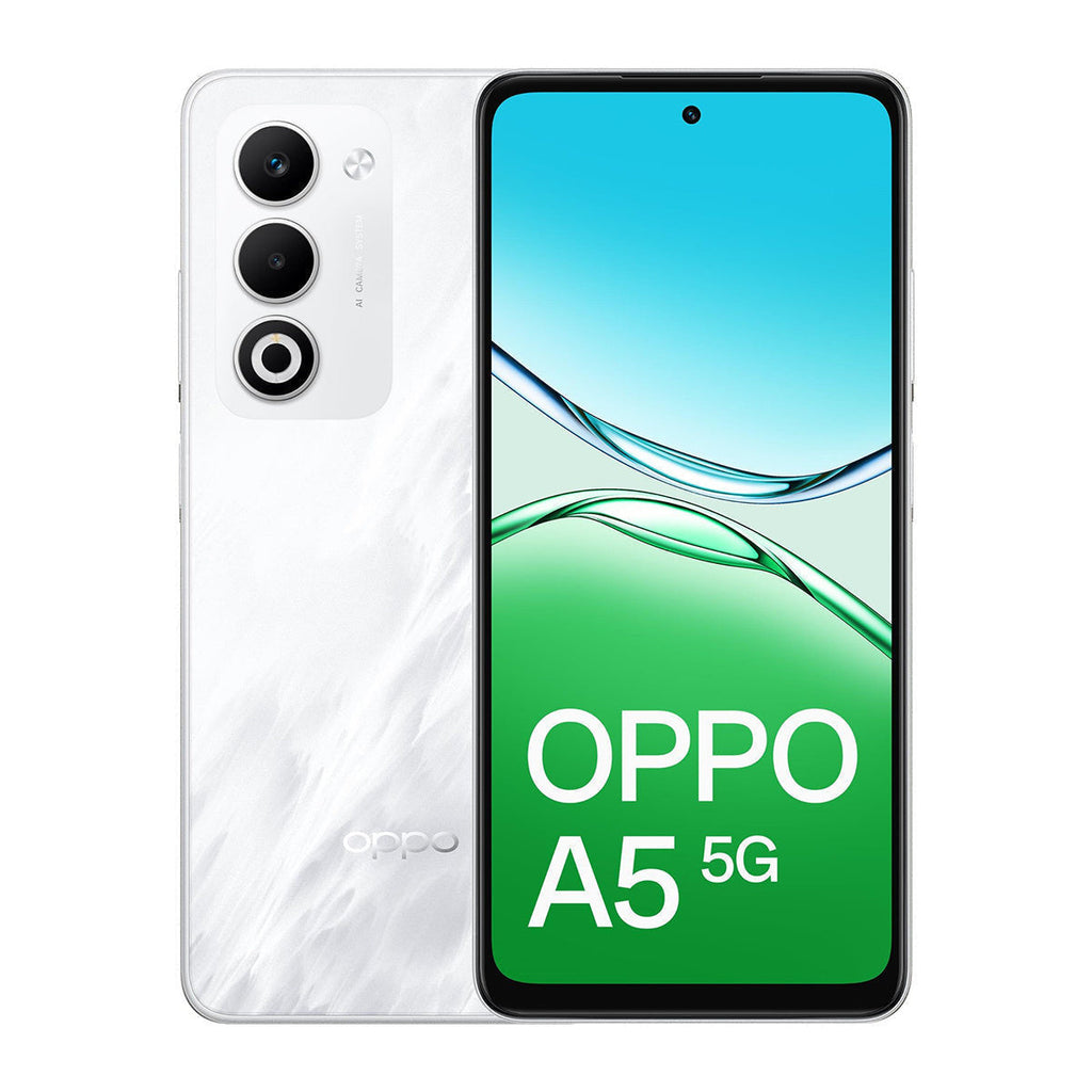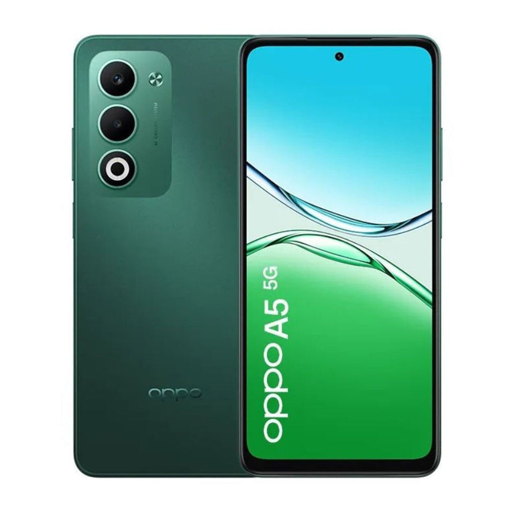 Product features:Specification Details Brand OPPO Model A5 5G Operating System ColorOS 15.0 Mobile Technology 5G Dual SIM Yes Color Green Warranty 2 years Display Size 6.67 inches Display Resolution 1604 × 720 px Display Type LCD Processor MediaTek Dimensity 6300 RAM 8 GB Internal Storage 256 GB Rear Camera 50 MP Front Camera 8 MP Battery Capacity 6000 mAh / 22.74 Wh Fast Charging Yes Wi-Fi Yes Bluetooth Yes Bluetooth Version 5.0 GPS Yes Audio Jack 3.5 mm Yes Connector Type USB Type-C Fingerprint Reader Yes Sensors Proximity sensor, Ambient light sensor, Accelerometer, Optical fingerprint sensor Height 16.57 cm Width 7.62 cm Depth 0.79 cm Weight 194 g Requires Power Adapter No Adapter Type Not applicable Includes Adapter No Plug Type Flat pin Box Contents Phone ×1, USB data cable ×1, Charger ×1, SIM eject tool ×1, Quick start guide ×1, Safety guide ×1, Protective case ×1
