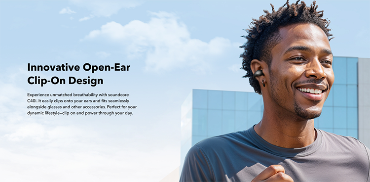 Enjoy unmatched comfort with the soundcore C40i open-ear earbuds. Designed with a stable yet airy clip-on style, they provide ultimate breathability, letting you enjoy your favorite music with total freedom.
