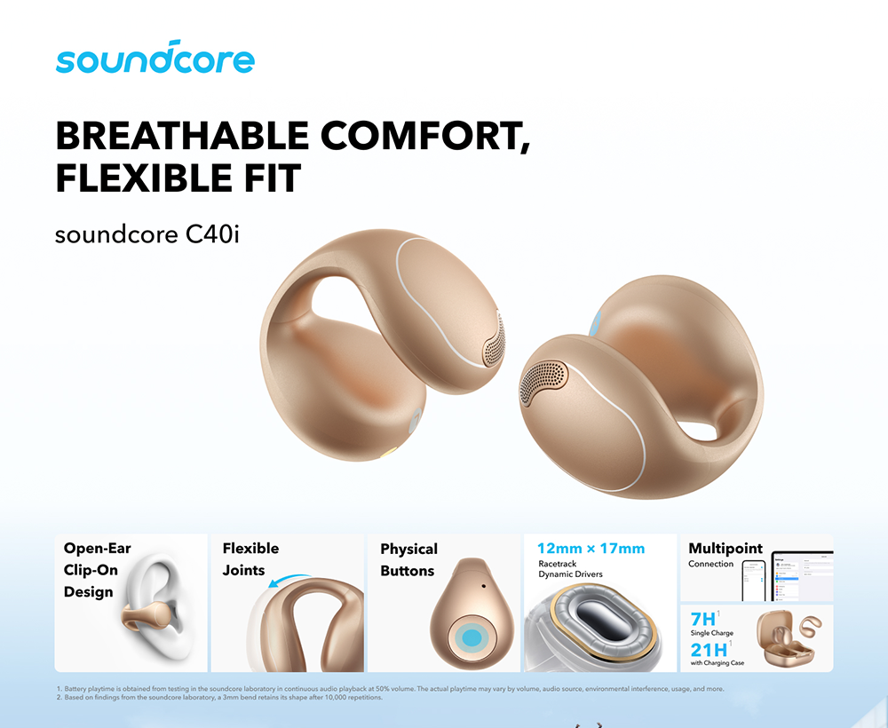 Enjoy unmatched comfort with the soundcore C40i open-ear earbuds. Designed with a stable yet airy clip-on style, they provide ultimate breathability, letting you enjoy your favorite music with total freedom.