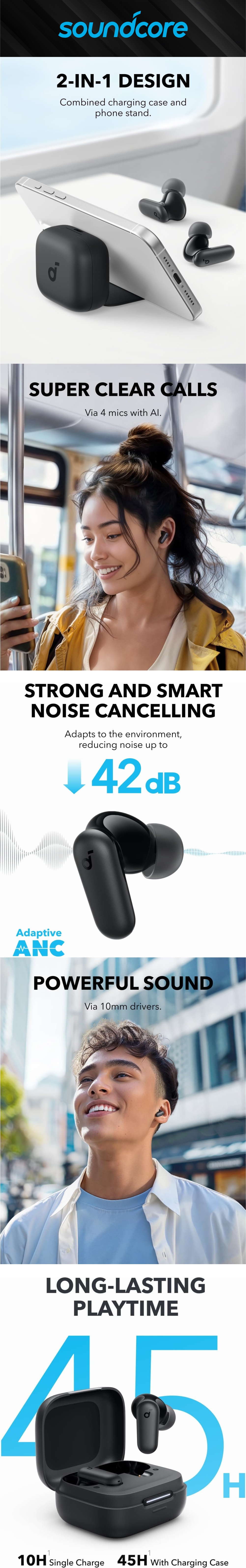 The Soundcore P30i earbuds are designed to deliver powerful sound, smart noise cancelling, and everyday convenience at great value. Featuring advanced adaptive ANC that reduces noise by up to 42dB, they automatically adjust to your surroundings so you can stay focused whether you're commuting, travelling, or relaxing.
