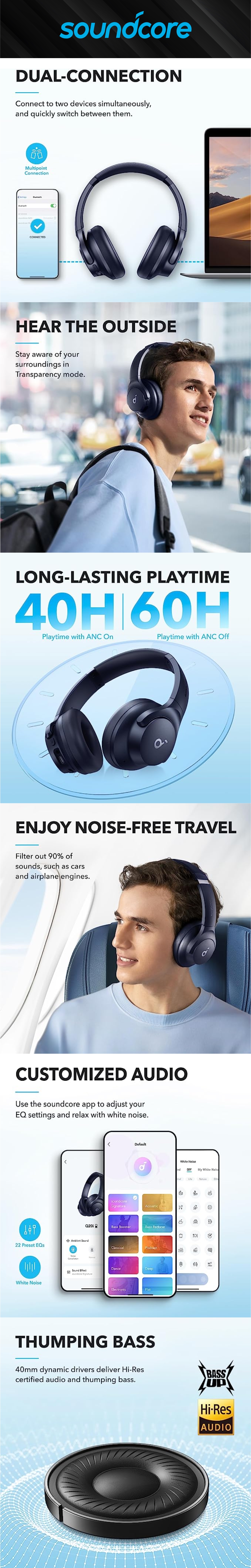 The Soundcore Q20i headphones are built to deliver powerful sound, effective noise cancelling, and outstanding battery life at an affordable price. Featuring hybrid active noise cancelling, they use multiple microphones to detect and reduce up to 90% of external noise—making them ideal for commuting, travel, and everyday use.
