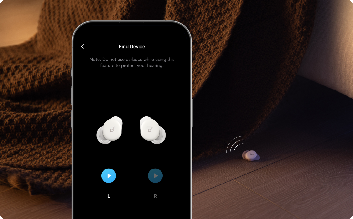 Lose an earbud? A single tap of the soundcore app can help. Use "Find Device" to have your earbuds let out a sound that makes them easy to locate.