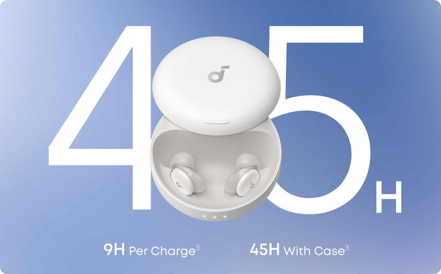3. Normal use playtime is based on soundcore laboratory testing, with ANC enabled for 9 hours and 1 hour of bluetooth audio playback at 50% volume. When sleep is detected, audio playback will automatically stop to reduce disturbance. Actual performance may vary depending on usage conditions.