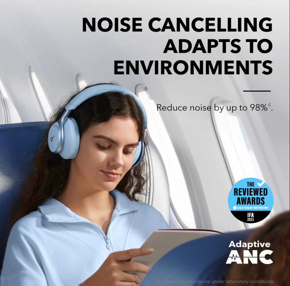 • Reduce noise by up to 98%* with adaptive noise cancelling *Tested by soundcore under laboratory conditions