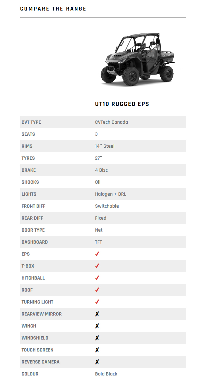 Experience uncompromised utility with the UT10 Rugged EPS. This rugged workhorse boasts a tilting bed box with an impressive load capacity of 450kg, making heavy lifting a breeze. With a remarkable payload capacity of 680kg and the ability to tow up to 1,134kg, it’s your trusted companion for handling tough tasks on the farm, job site, or wherever your adventures take you. The UT10 Rugged EPS is built to tackle the most demanding challenges with ease and efficiency.